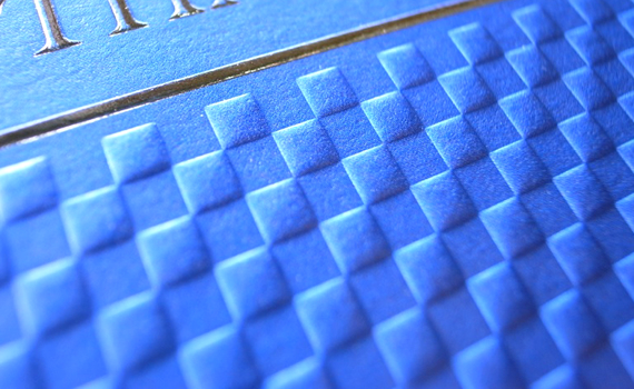 エンボス加工とは凸版と凹版の間に紙などの材料をはさみプレスして材料の表面を浮き上がらせる加工方法です。