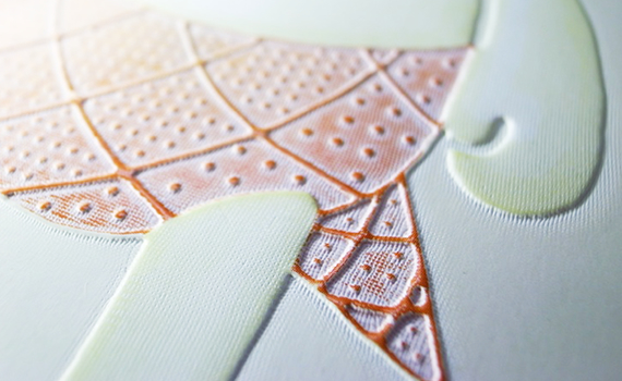 材料の表面に文字や絵柄奪どを浮き上がらせることによって陰影を作ることができます。