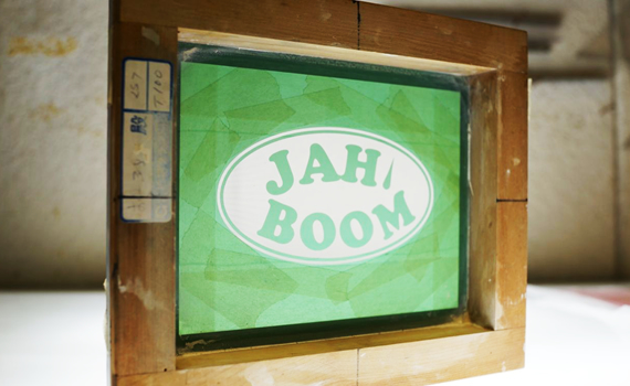 乳剤をよく乾燥させたら、版にポジフィルムを圧着させて一定時間紫外線をあて乳剤を硬化させます。