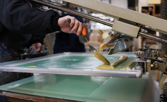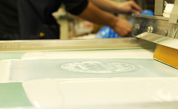 シルクスクリーン印刷とは、木枠に絹(シルク)を張って印刷部分以外のシルクを乳剤で隠蔽しゴムベラ(スキージ)を使って印刷物にインクをこすり落とす印刷方法です。